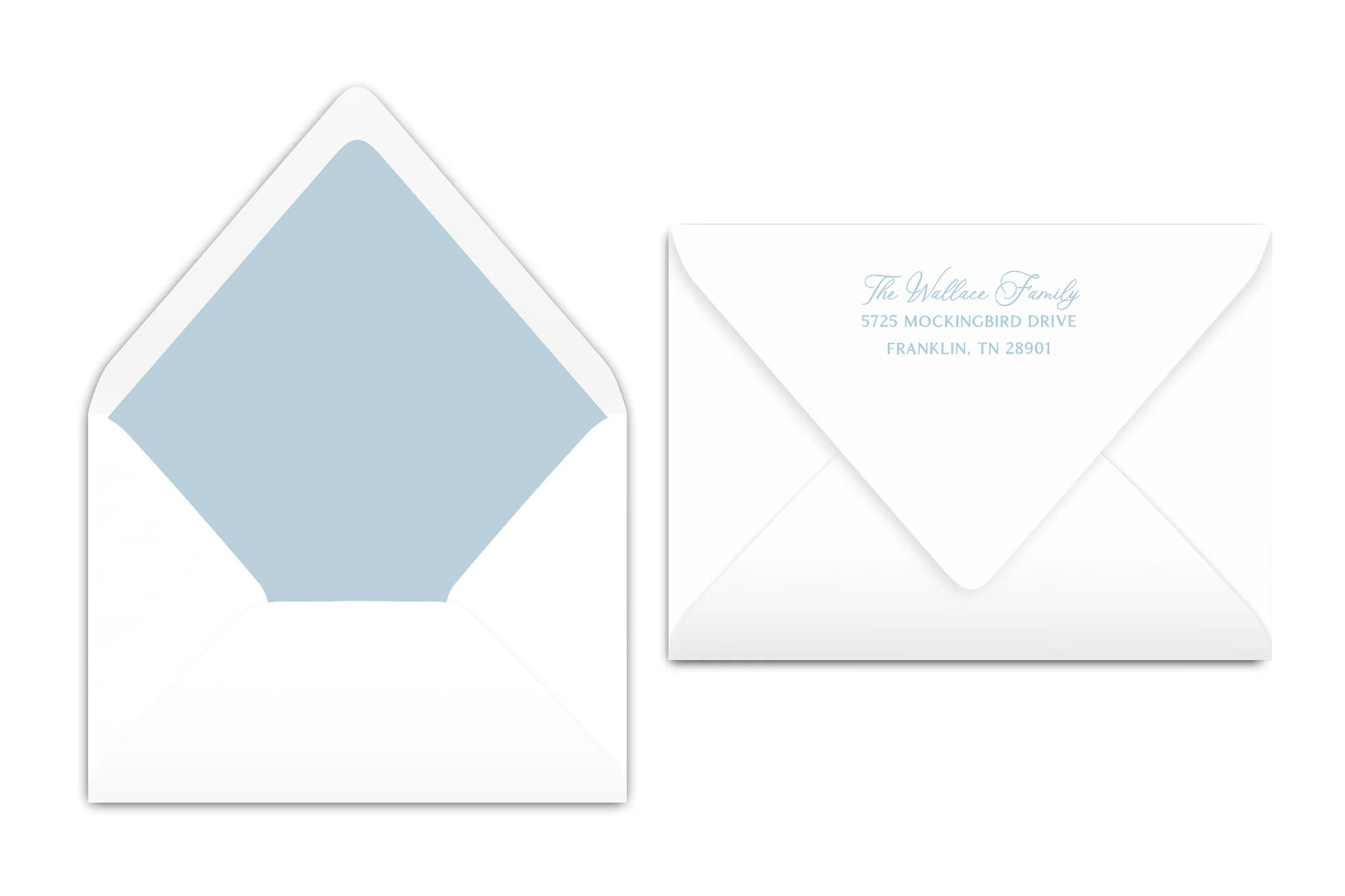 Straight flap white envelopes are included. Adding return address printing and/or envelope liners will upgrade to euro flap envelopes.
